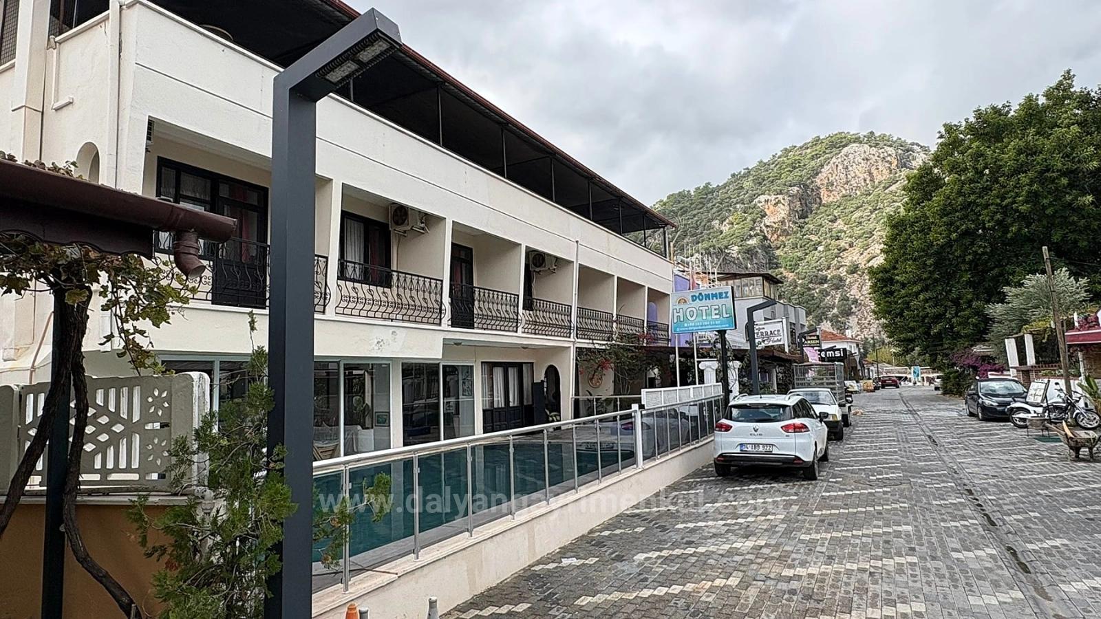 Der Pool hat eine Fläche von 50 m². Am Eingang befinden sich Rezeption und Wartebereich. Die großzügige Terrasse bietet einen herrlichen Blick auf die Kanäle und Felsengräber. Sie umfasst außerdem eine Küche und eine Bar und ist 400 m² groß. Die Terrasse eignet sich ideal als Restaurant. Einkaufsmöglichkeiten sind fußläufig erreichbar. Der Strand von Iztuzu ist 10 km und der Flughafen Dalaman 25 km entfernt. Preis des Boutique-Hotels: 85.000.000 TL (Das Hotel kann auf Anfrage komplett renoviert werden.)