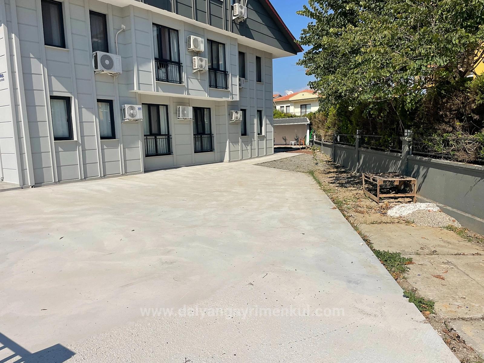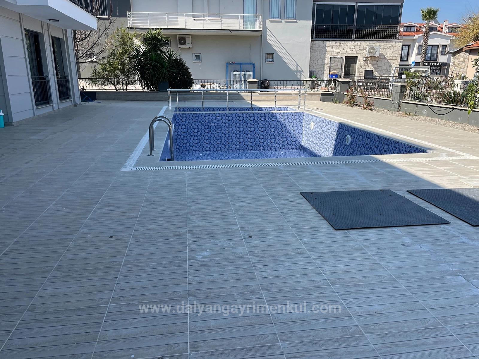 A ground floor apartment is for sale in a building with 8 apartments on a 1000m2 plot in the center of Dalyan. It has 2 bedrooms, 1 living room with open kitchen, and 1 bathroom, totaling 75 m2 of usable space. It is fully furnished. It is a new building and requires no renovations. It has a shared outdoor swimming pool. It is within walking distance of shopping markets. The apartment is 10 km from Iztuzu Beach and 25 km from the airport. The price is: 210,000 EURO