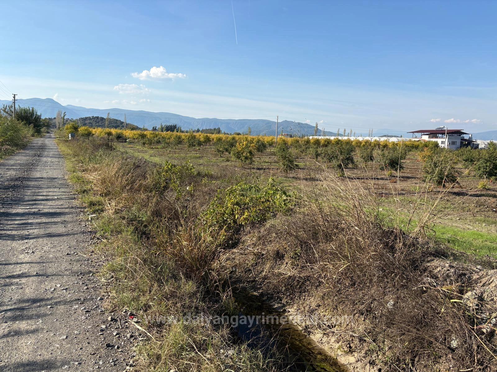In Eskiköy, a total of 21,500m2 of land consisting of 2 adjacent parcels of 11,262+10,238m2 is for sale. It has 2-year-old full pomegranate trees. There are no road, water, electricity or telephone problems. The land has electricity and a deep artesian well. The irrigation system is drip. The field has a cadastral road. There are settlements around it. The price of the land, which is 3 km from Dalyan, 10 km from Ortaca, 13 km from İztuzu Beach and 25 km from the airport: 37,500,000tl