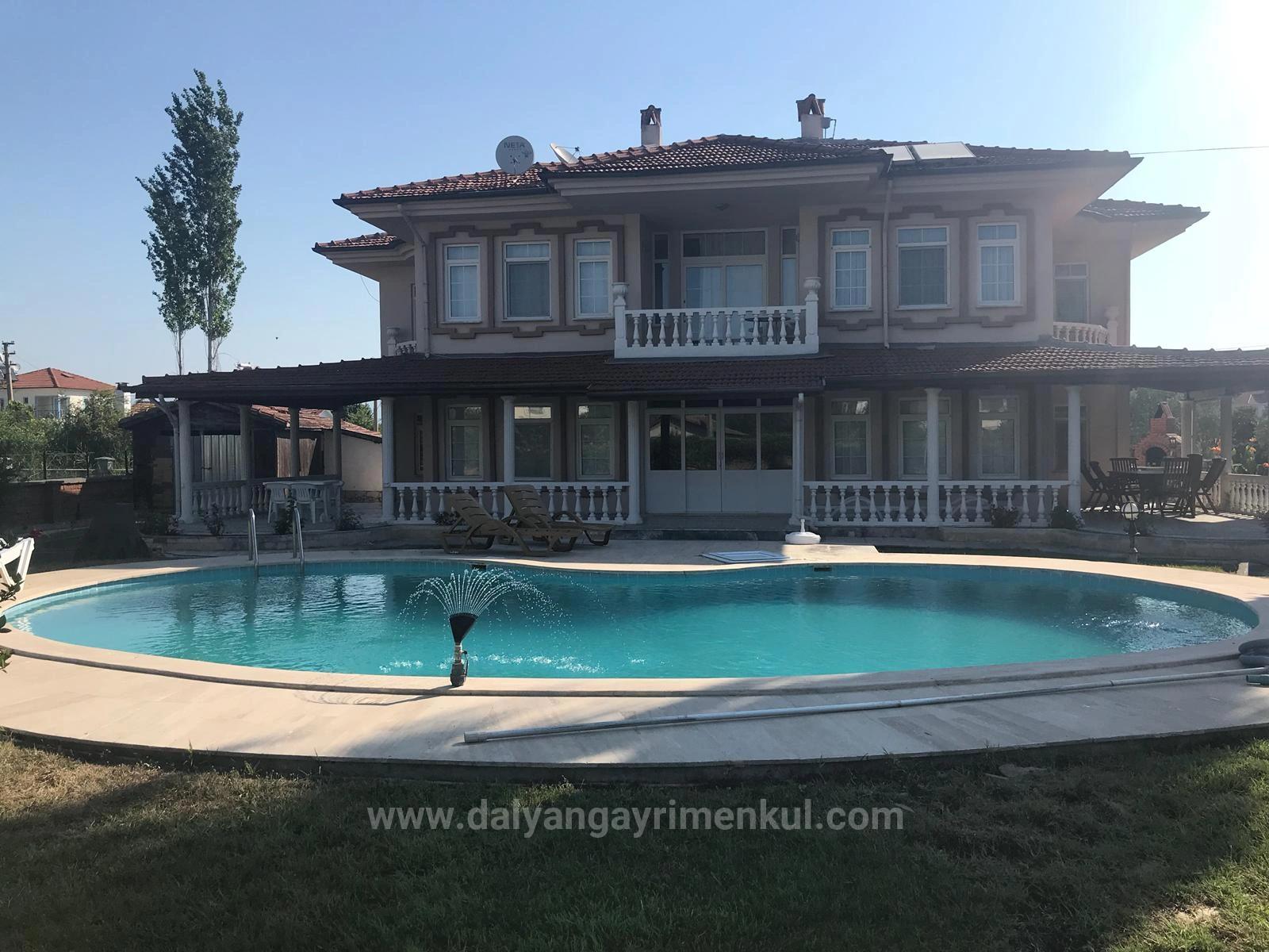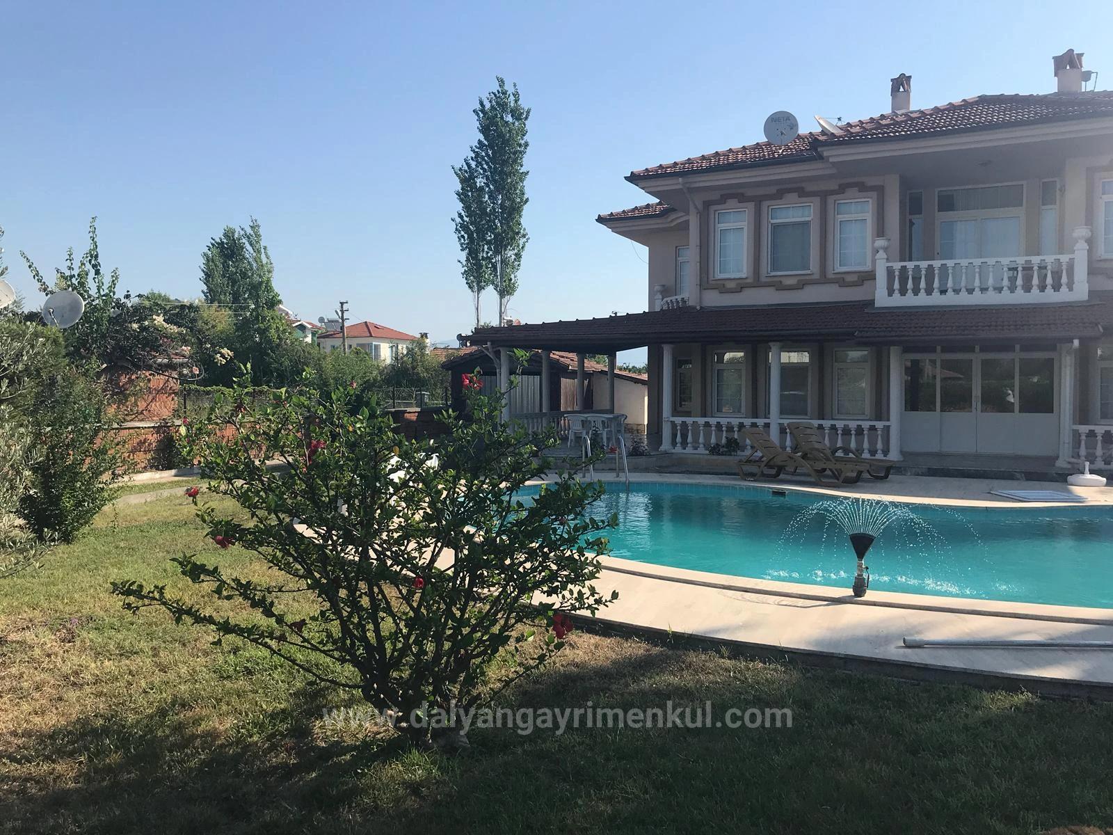 A villa with 4 bedrooms, a large open-plan living room, a separate kitchen, and 3 bathrooms, totaling 250m2 of indoor living space, is for sale in Dalyan on a 1000m2 plot. Each room has air conditioning. Heating is provided by a combi boiler. There is a fireplace and an outdoor swimming pool. The villa, which has a large garden, is within walking distance of shopping markets and the local market. It is 10 km from Iztuzu Beach and 25 km from the airport. It is within walking distance of the center. The villa requires some renovation. Price: 425,000 GBP