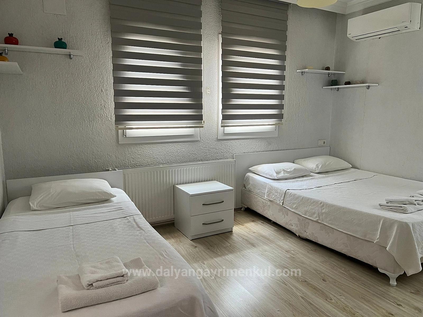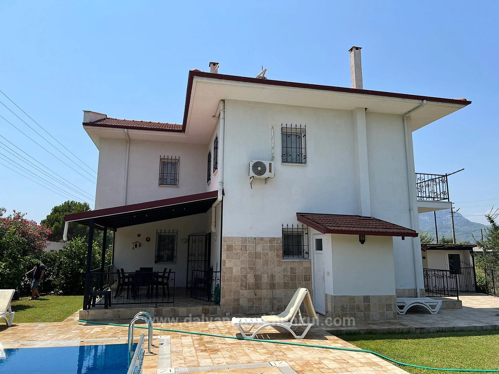 3+1 villa with pool on a 600m2 corner plot in Dalyan is for sale. On the ground floor there is a living room, open kitchen, sink and WC, and on the second floor there are 3 bedrooms and 1 shared bathroom. 1 bedroom also has an en-suite bathroom.  Every room is air conditioned. There is a heat pump heating system. It is fully furnished. It has a detached entrance and has a storage room, sink-WC and indoor parking space in the garden. There is a children's pool.