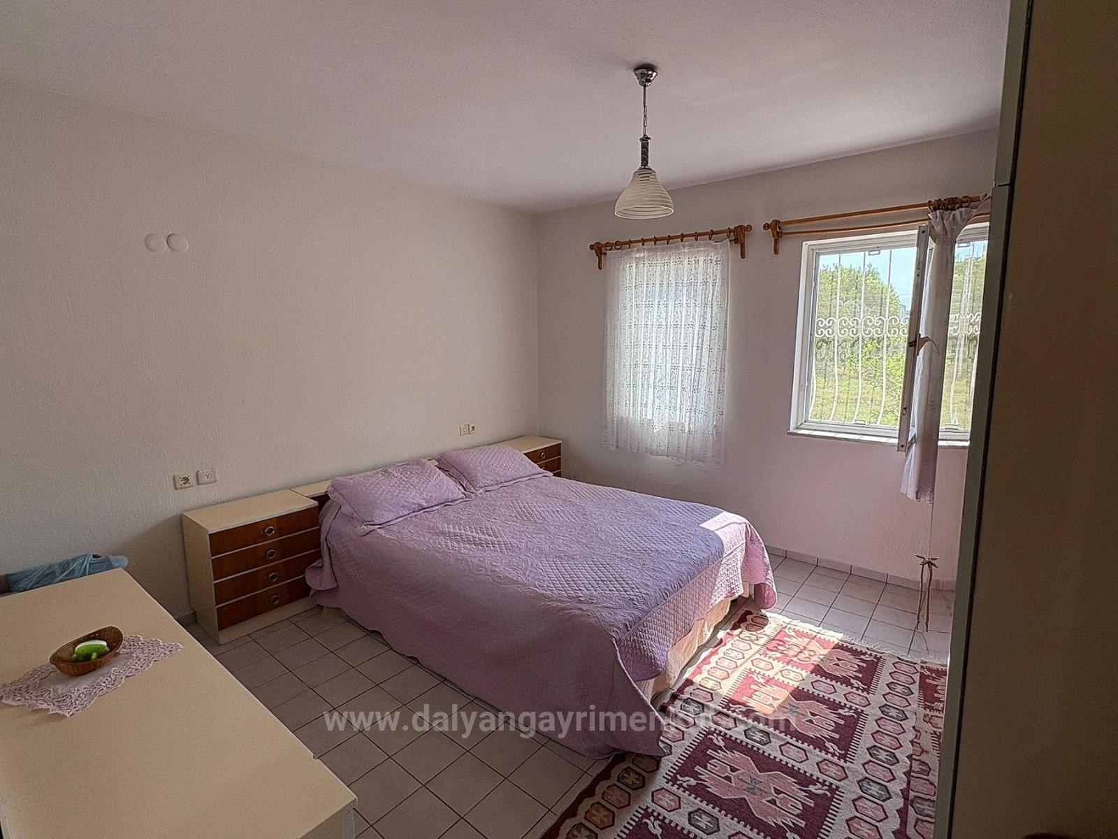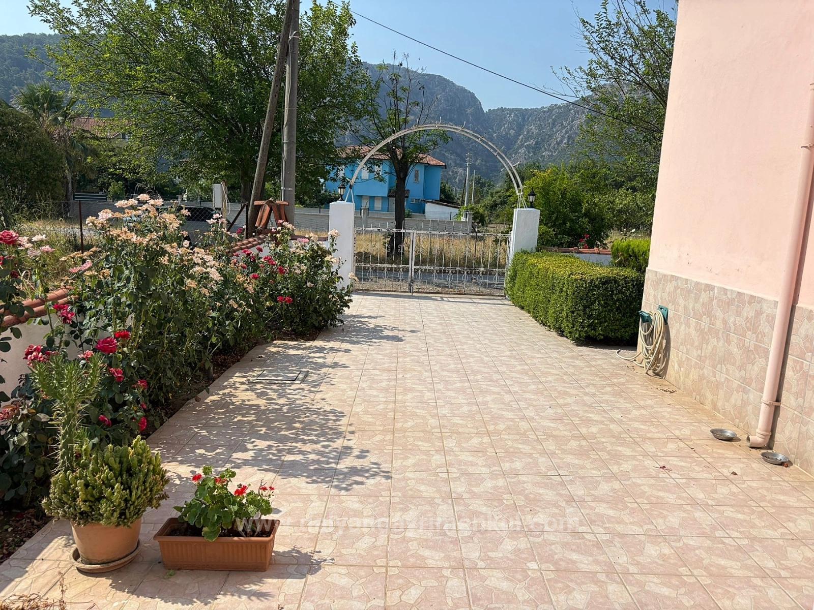 A two-story detached house is for sale in Okçular on a 514 m2 plot. The house consists of two independent apartments, one above the other. The ground floor has 3 bedrooms, 1 living room, 1 kitchen, 1 bathroom, and a terrace. The second floor has 3 bedrooms, 1 living room, 1 kitchen, 1 bathroom, and 2 balconies. One balcony has a fireplace and a seating area. There is an open parking area, a storage room, and a well for garden irrigation. There are also various fruit trees in the garden. The house is 3 km from Dalyan center, within walking distance of shopping markets, 13 km from Iztuzu Beach, and 26 km from the airport. The price is 19,000,000 TL