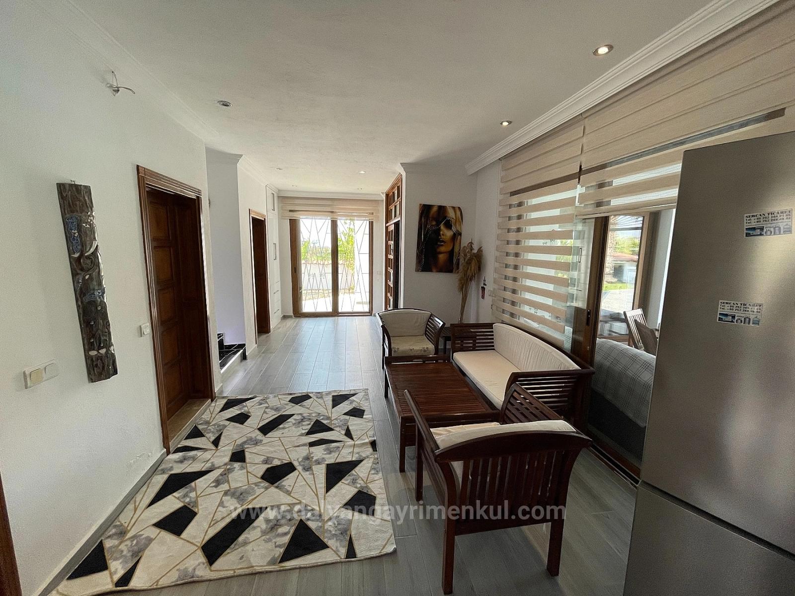 Dalyan İztuzu plaj yolu tarafında 7,000m2 arsa içerisinde 4 yatak odalı 1 salon şömüneli + mutfak bağımsız 4 banyolu full eşyalı herşey yenilenmiş her odanın kiliması vardır tüm beyez eşyaları yenidir. özel müstakil tuzlu su sistemli açık yüzme havuzlu ayrıca villanın önünde yapayı balıklı göl vardır. hahçe dizaynı yapılmı dişarıda bar bükü ve kamalya köşkü vardır. villanın geliş balkonu ve teraslıdır. hiç masrafı yoktur alış veriş ve sent pazarında 5 dk iztuzu plajına 8 km havaalanına 25 km mesafesi olan villa iztuzu ve kral mezarları manzaralıdır. fiyatı: 1,100,000GBP
